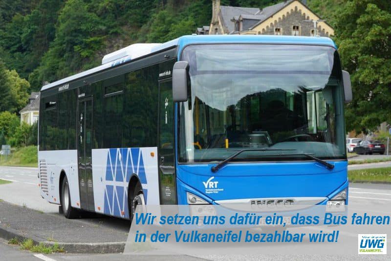 Aufgrund der rasant steigenden Energiepreise muss das Bus fahren für unsere Bürgerinnen und Bürger in der Vulkaneifel kostengünstiger werden! Dafür setzt sich die UWG Vulkaneifel gemeinsam mit allen anderen Fraktionen im Kreistag ein.Der Kreistag Vulkaneifel hat einstimmig beschlossen, dass Jugendliche, Senioren, Transferempfänger und Geflüchtete in einem Pilotprojekt kostenlose Tickets erhalten sollen.Nun wird ein Konzept erarbeitet…