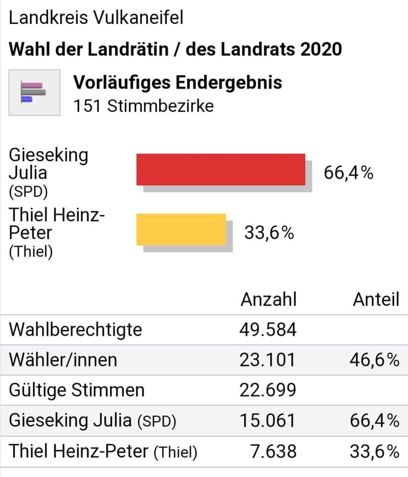 Julia Gieseking ist die neue Landrätin des Landkreises Vulkaneifel! Veröffentlicht November 29, 2020 by admin in Kreistag Vulkaneifel, Landratswahl, Landratswahl 29.November Welch ein gigantisches Wahlergebnis!!Ganz herzliche Glückwünsche an unsere erste Landrätin des Landkreises Vulkaneifel :Julia Gieseking!